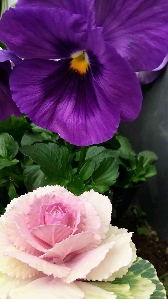 ムラサキ💜の大輪パンジーさんを植える場所が無くて隅っこに仮置きしたら「葉牡丹に場所変わって下さい」って言ってるみたいです(笑)🤭
