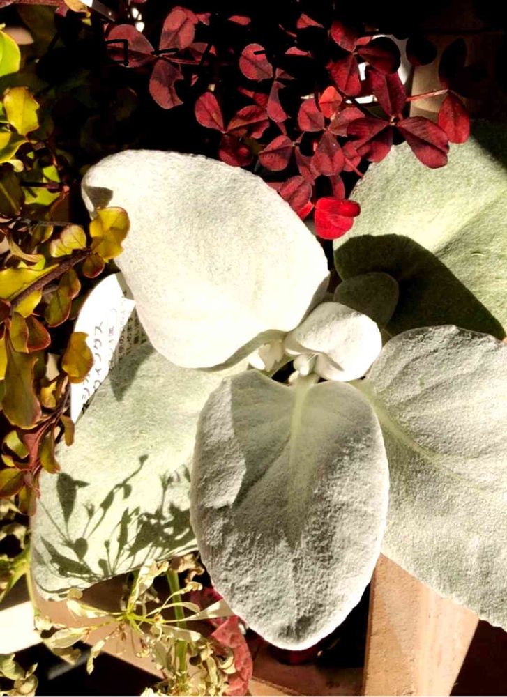 赤いクローバーとシロタエギクの仲間の寄せ植え
