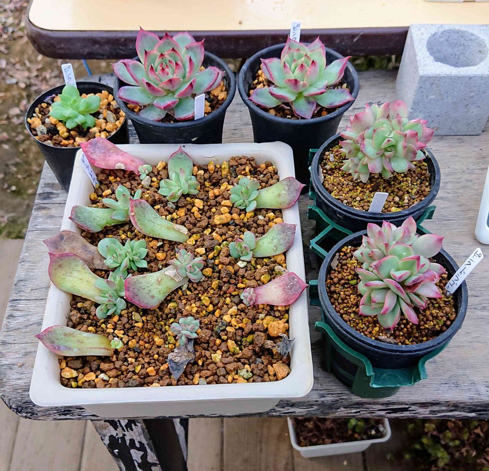 上の2つは先端、右2つが胴切り、後は葉挿しです🌱だいぶ大きく成りました👍️
