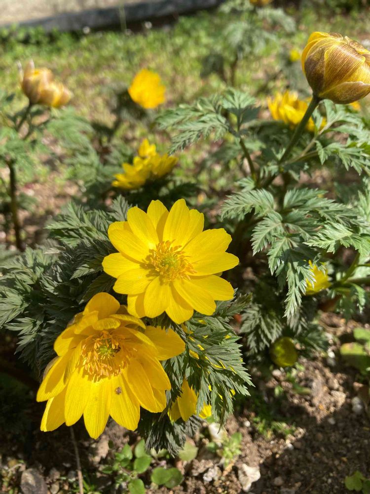 福寿草が満開に✨✨ この写真では見えないけれどシャクヤクの芽もちょっと顔を出していました😊 今日は午後からぽかぽか陽気。鼻もむずむず🥸 春ですね♪