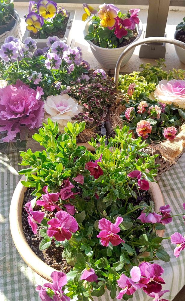 ベランダの寄せ植え達、ビオラや葉牡丹は今が一番良い時かも😆