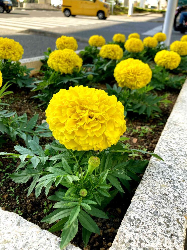 同じく駅のロータリーの花壇に可愛らしい花が〜アフリカン・マリーゴールド🌼🌼🌼名前は今回調べて初めて知りました。
