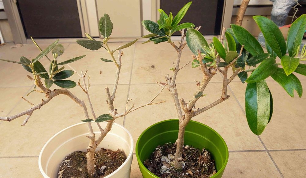 この冬、ボロボロになって投げ売りされていた室内向け?のふたつ。白鉢は屋外、緑鉢は室内で育てていますが、復活しつつあります~