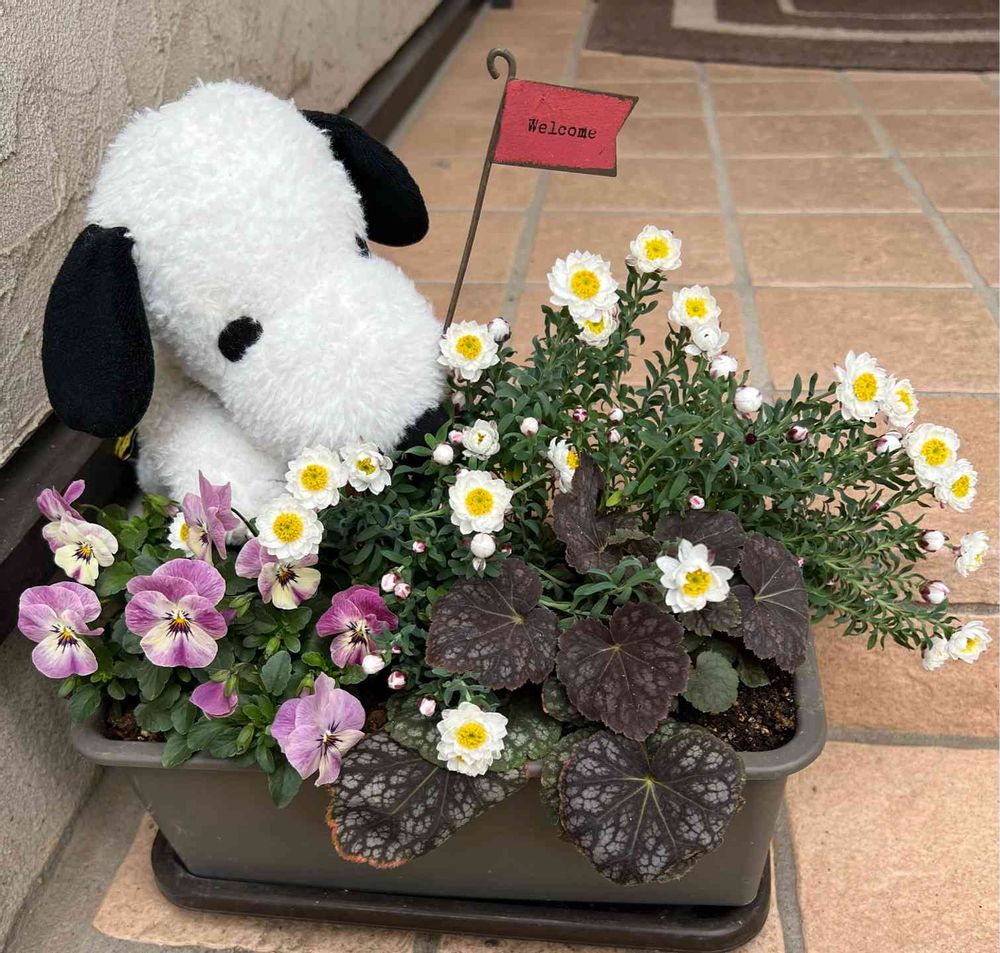 1番ちびっこのスヌーピー君ですが、小さくてかわいい花たちに比べるとずいぶん大きく見えるけど、やっぱりかわいい💕