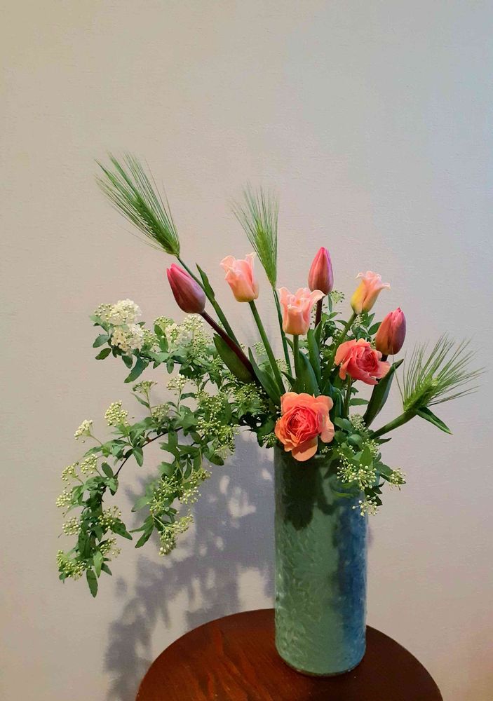 さて全体にバランスですが、左が重く感じます、これはコデマリが入ったことと青麦が右から左に高く入ったことが原因です。またチューリップも左側に高いものが入っていますので、偏った印象になりました。青麦は高いものは中央か右側に入れ替えるといいですね。また、長く使わずに短くしで穂先を楽しむという生け方も自由花では出来ます。