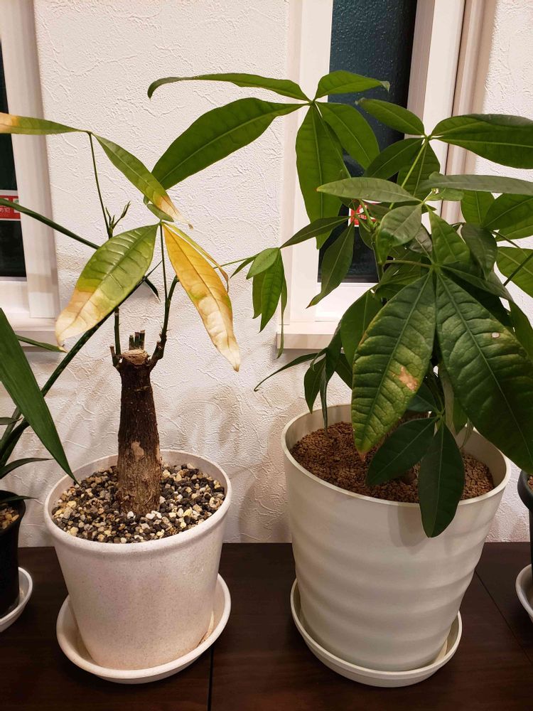 同じ時期に買ったパキラです。土の違いでここまで差が・・・。片方は硬質赤玉のみ。もう片方はいろいろ混ざった土です。どちらも肥料はあげました。水やりの影響かな。