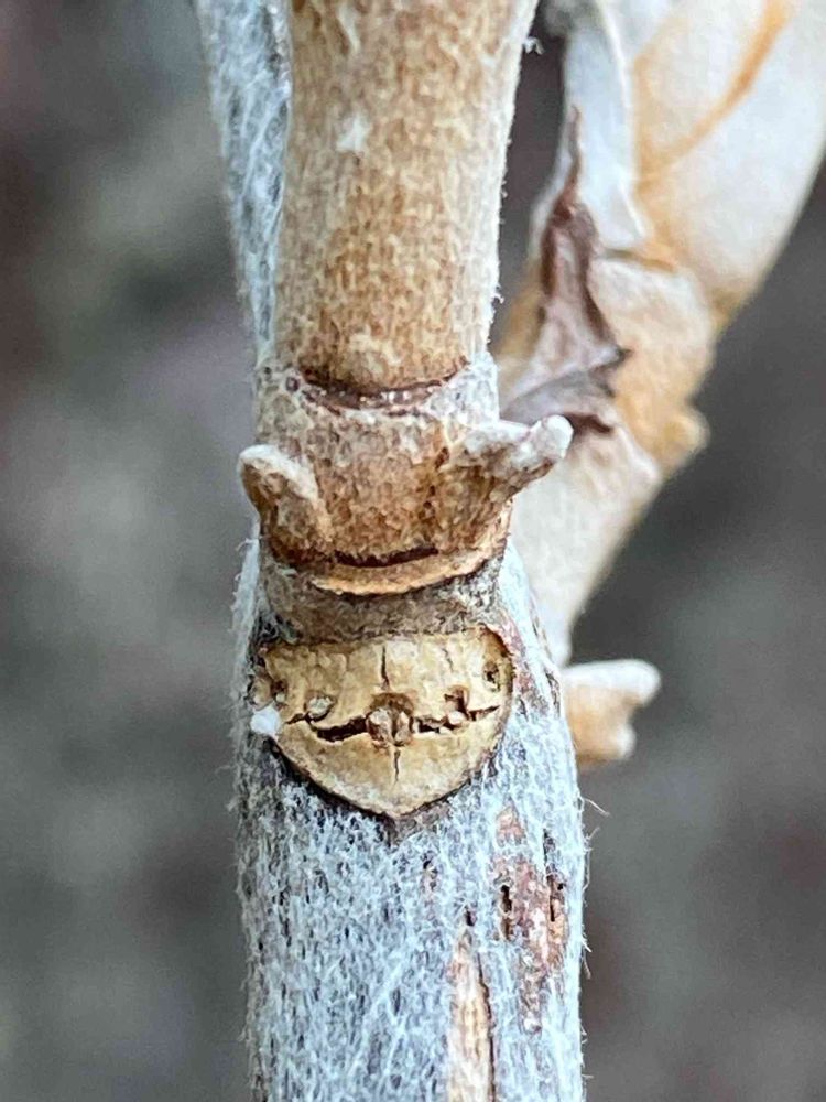 カシワバアジサイの葉痕に、プププって笑いが出てしまう。