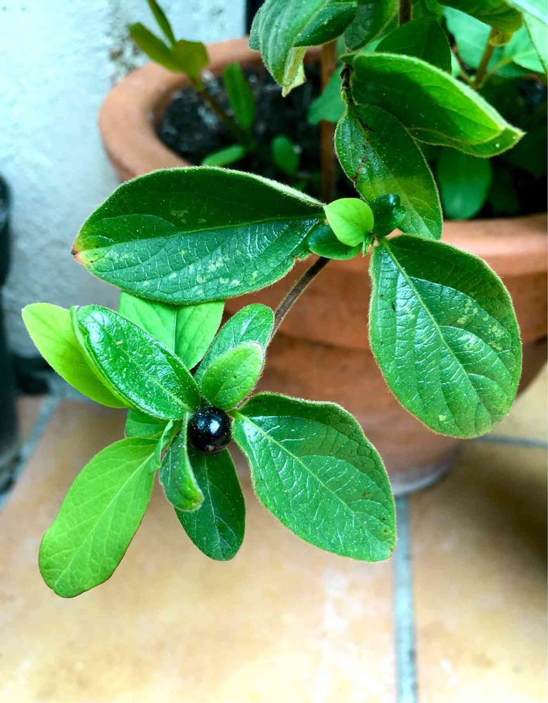 スイカズラ(ハニーサックル)の実です。スイカズラは花の蜜を吸うと甘いことから「吸葛(すいかずら)」という名前が付いたようですが、花後2つの小さな実が付き=うちは一つしかつきませんでしたが、夏の間は濃いグリーンをしていて、この様に熟すと光沢のある黒に変化する様です。