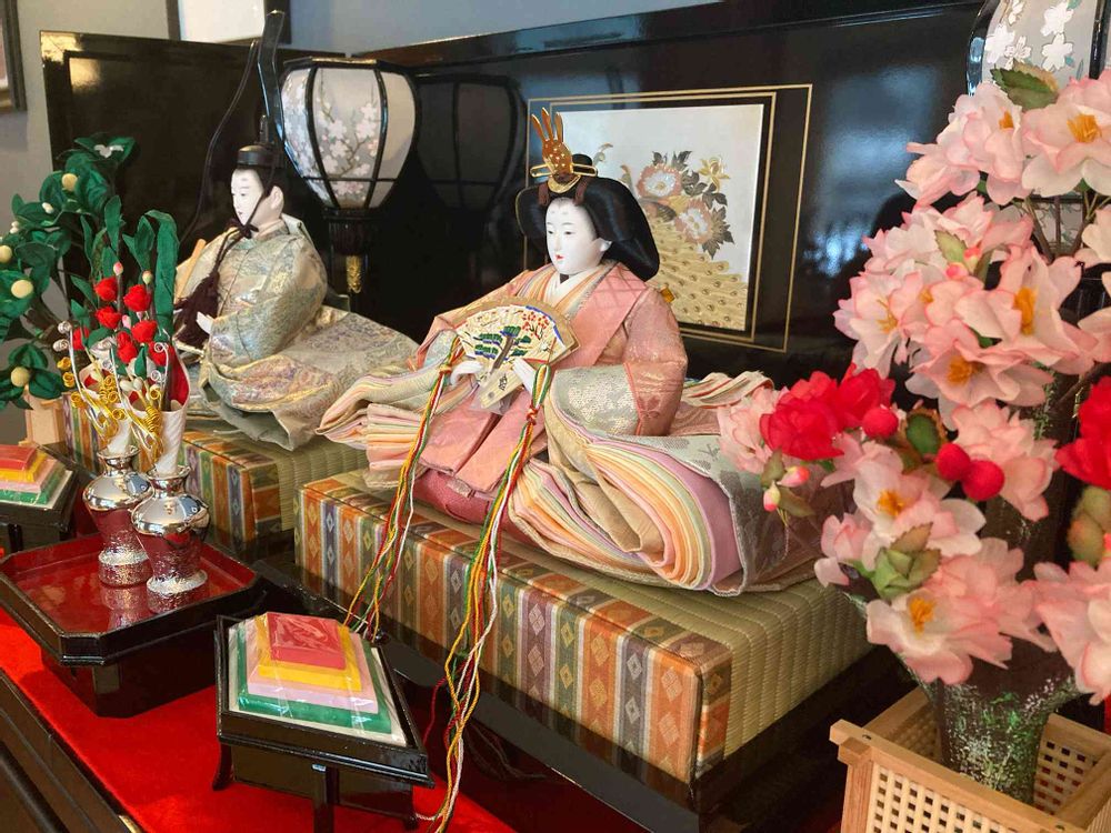 30年近く前、両親が娘に贈ってくれたのです。同時期にお嬢さんを迎えた友人宅にも似たようなものがあり、その頃の流行りがこんな感じだったのかもしれません。ちなみに私のは、もっと赤っぽい着物を着たお雛様の七段飾りでした。