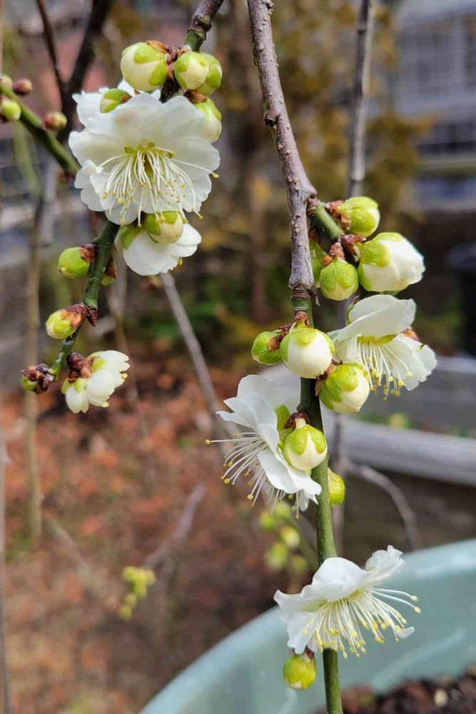 このところの暖かさで、庭の枝垂れ白梅が咲き始めました。