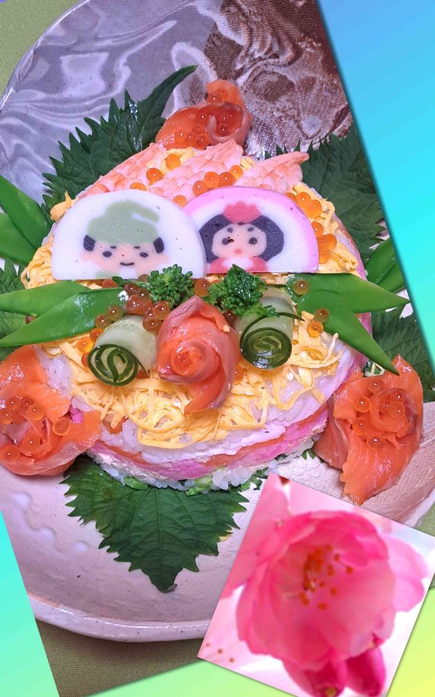 それぞれ間にエビやサーモン、ツナマヨ💕入れてトッピングは、いつもの「生協」さんのお雛様かまぼこ🤭