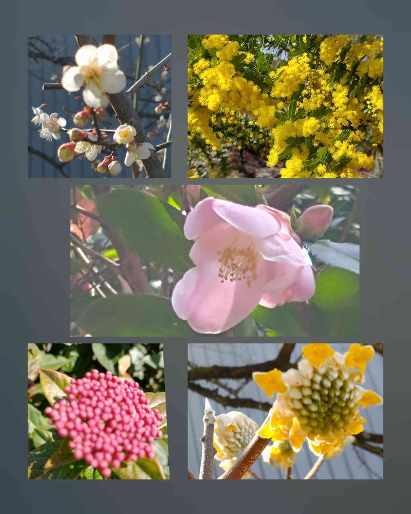 白梅 ミモザ ワビスケ椿 ビバーナム・ティヌス ミツマタ