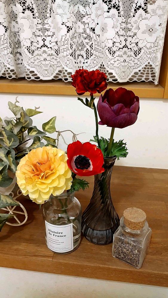 こんな感じでラックスやアネモネ、ルージュルージュを切り花にして飾ってます🌱✨🌱✨