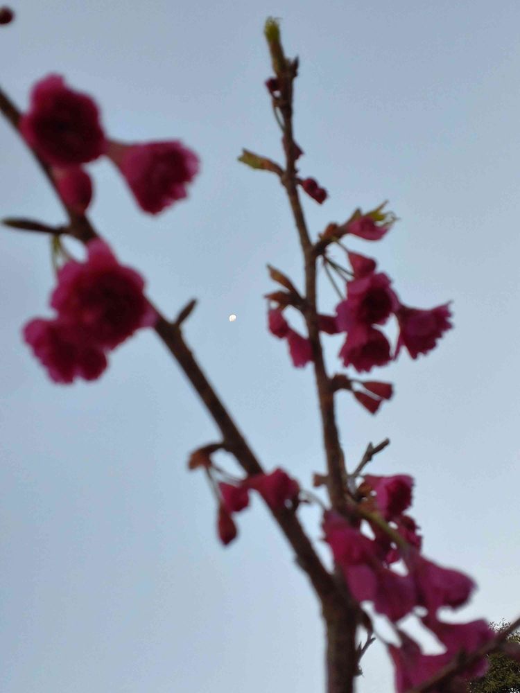 サクラの枝の向こうの東の空に、月が浮かんでる🌝