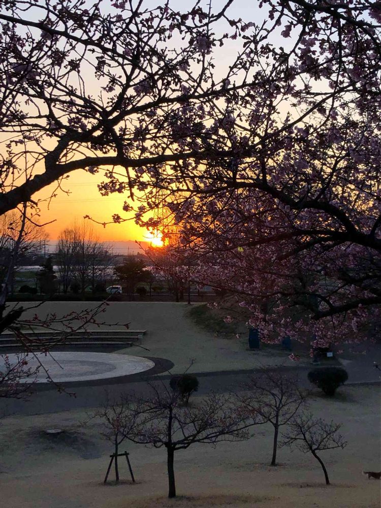 伊勢崎市民の森公園の河津桜と夕日のコラボ。😊👍🎶📸