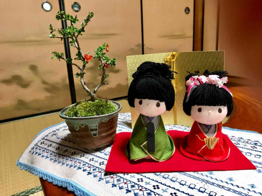 母の手作りのお雛様🎎とボクがプレゼントした長寿梅(木瓜の花)
