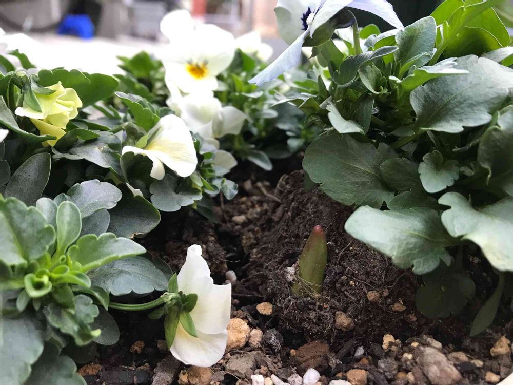 ウチにもチューリップとビオラのダブルデッカーいるんだけど、ビオラが鉢いっぱい広がってて、チューリップどした•́ω•̀)?覗き込んだら、ビオラの葉っぱを突き破って芽が伸びていました🤣