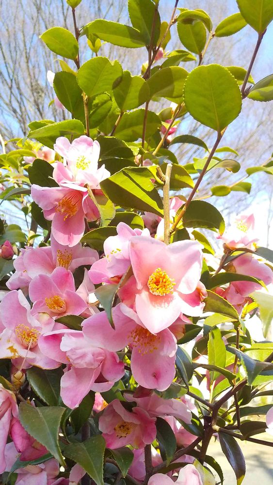こんにちは😊椿も色々あるんだねぇー名前は分からないけど可愛いピンクと白が混じって自転車降りて戻って、写真撮りましたよー😊