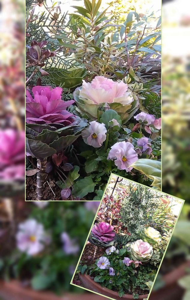 12月に寄植えしました❇️✨クリスマスの木(サルフレア)と切り花用ハボタン❛マダムバタフライー駿河の初日ー♥ロミオー初紅ー➕白いハボタンの3種他 根本に色々寄植え中です🎶