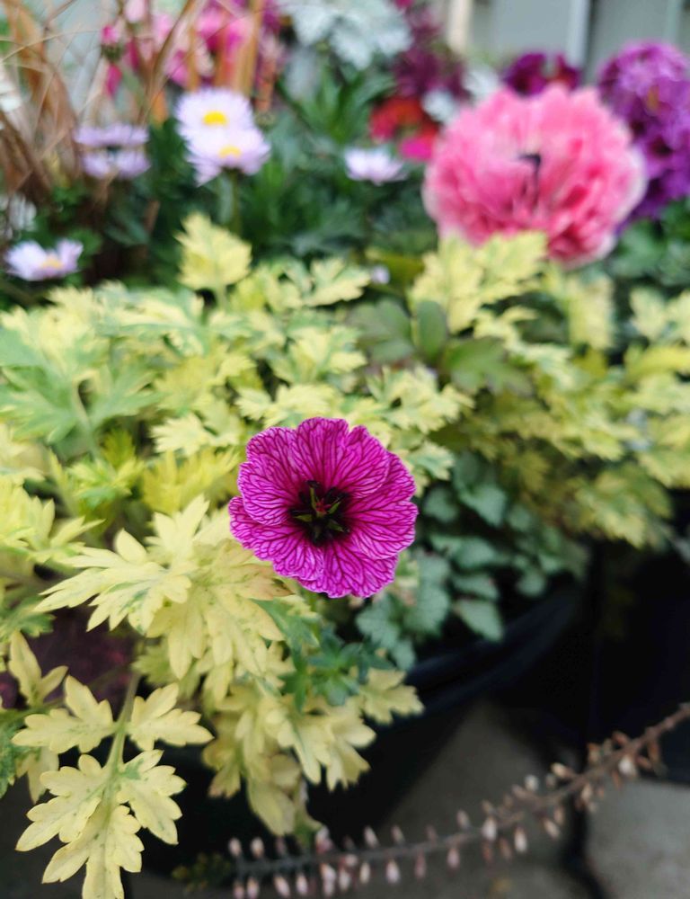 斑入りヨモギの間から首を伸ばしていたゲラニウム