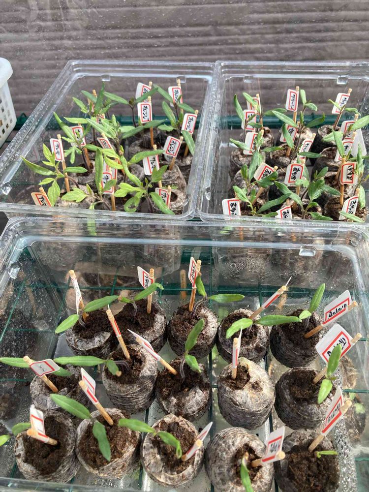 トマトはミニ・中玉・大玉・調理用を合計10種ちょっと作ってます。早いものは本葉が出始めてました。