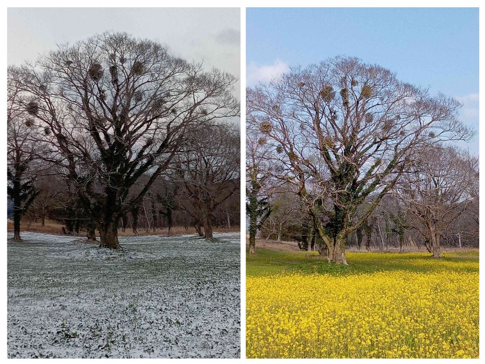 左は1/25 右は3/1 わずかにでた花穂も雪に縮こまり震えていたのがひと月ほど前のこと