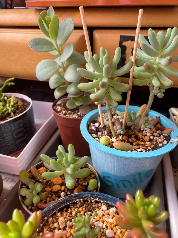 青い鉢のは、多肉の気持ちさんからわけてもらった子