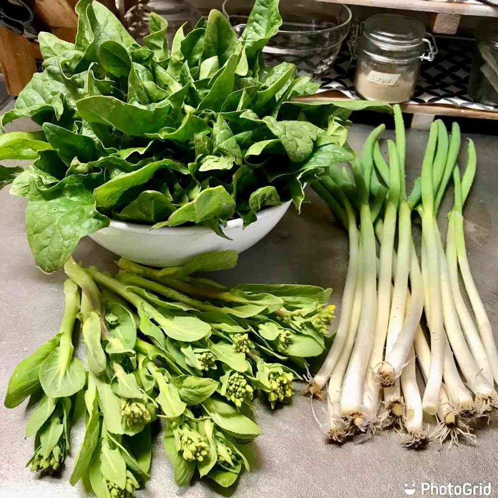 週末日曜☁️☔️野菜畑の恵みは、青梗菜🥬と法蓮草🥬とネギ😊。