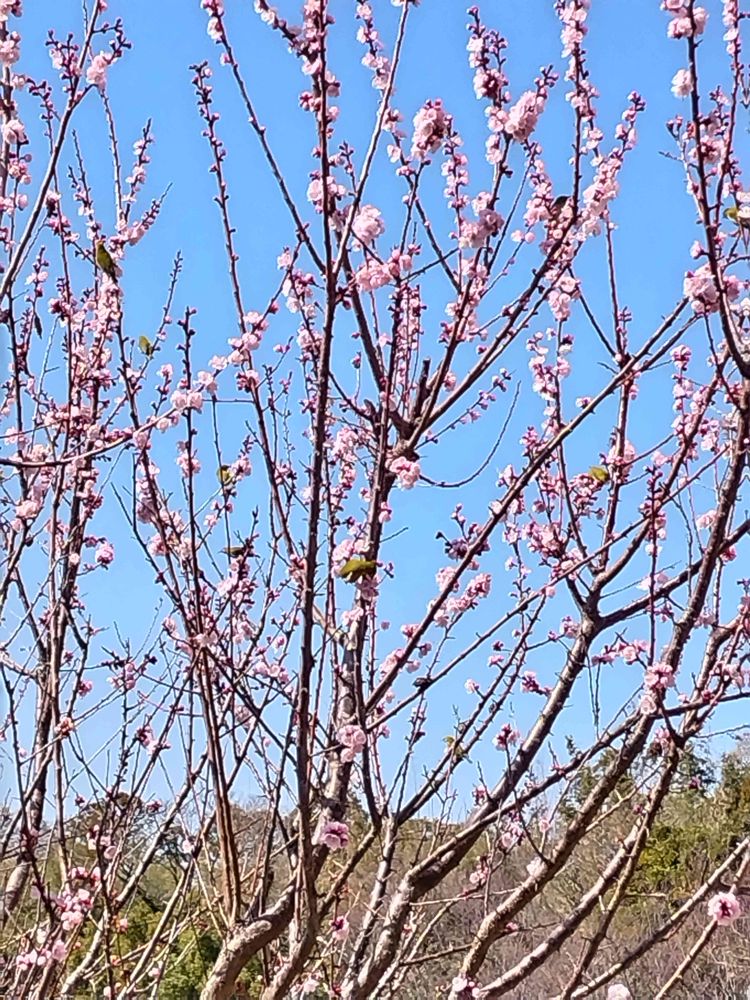 たくさん杏の木があるんですね。それに可愛いメジロさんが来ているなんて、桃源郷ですね✨