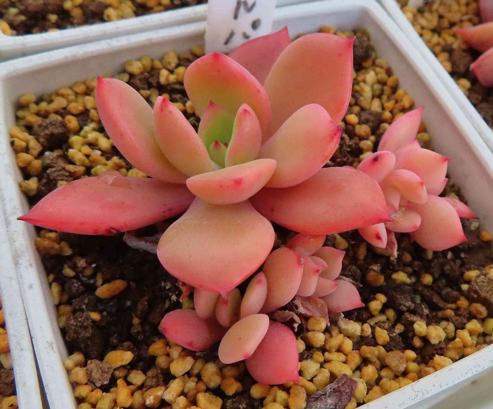 ほとんどピンク一色の状態で冬を越したエケベリアのネルパ。春になって成長点から黄緑が戻ってきた。葉挿し組だけど,すでにいくつか子株もできていて群生化しそう。