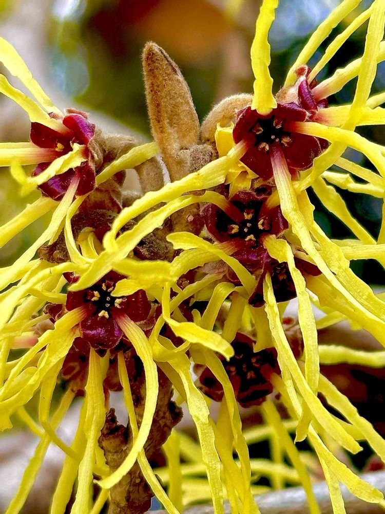 マンサクの花💛💜🤎良~く見ると不思議な咲き方してますね💓💕