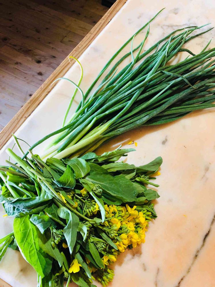菜の花は、オイルを少し落とした塩茹で、その茹で汁で、一文字も茹でる。