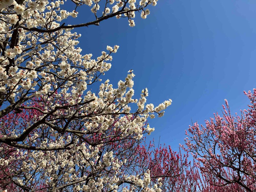 芳しい紅白の梅が、春の青空に元気に咲いている様子に癒やされますね。