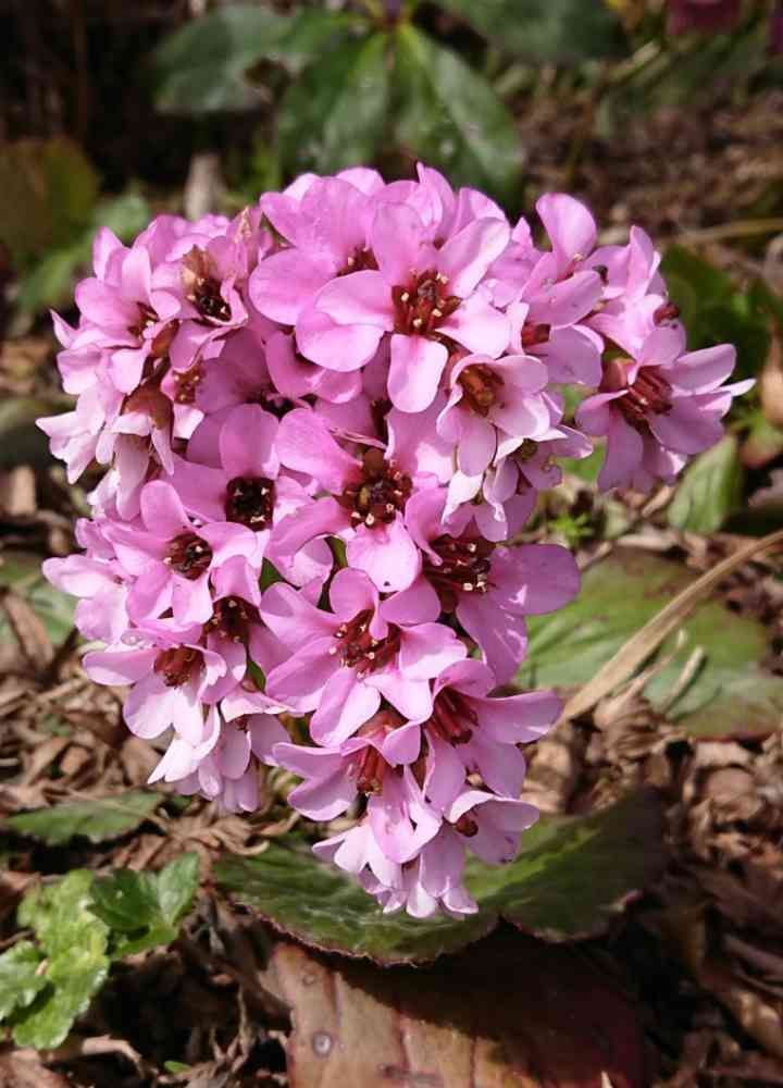 ユキノシタ科ベルゲニア属の多年草。東アジア〜中央アジア原産。明治時代初期に鑑賞用として渡来し、庭や花壇、鉢植えなどで栽培される園芸植物。高山植物なので乾燥や寒さに強いが、暑さや多湿に弱い。丈夫で育てやすいので、株分けにされてあちこちで見られる。常緑の葉はしゃもじのような形で厚く艶がある。花期は2~5月。高さ20〜30㎝の花茎に淡紅色あるいは白色の花が多数集まってつく。別種どうしの交雑種も多く作られているが、どれも区別せずヒマラヤユキノシタの名で流通している。