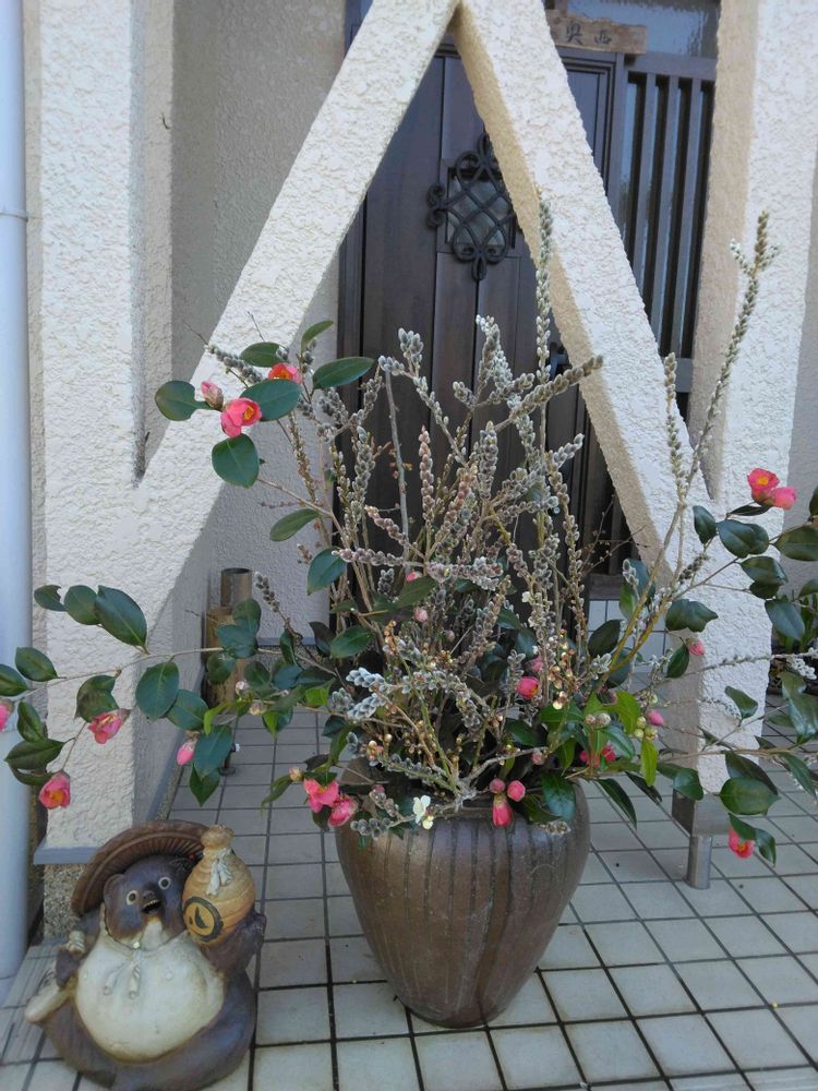 猫柳を沢山頂き、何を添えようかと考えていた矢先、藪ツバキを頂き、壺にいけました😊