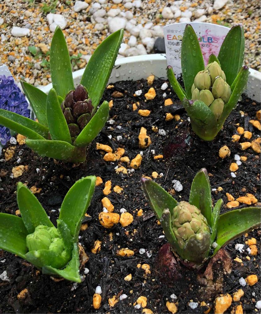 ここのところの温かい日差しで我が家もヒヤシンスの花が、伸び出してきました。寄植えでついいろいろな色を入れたいと色違いの球根を植えたのですが、伸び方にズレが…。開花時期はズレそうです。