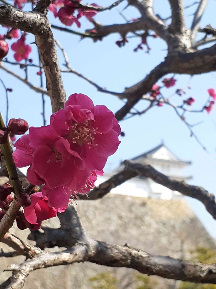 白いお城に美しい紅梅が映えてとても素敵です~🏯🌸🌿