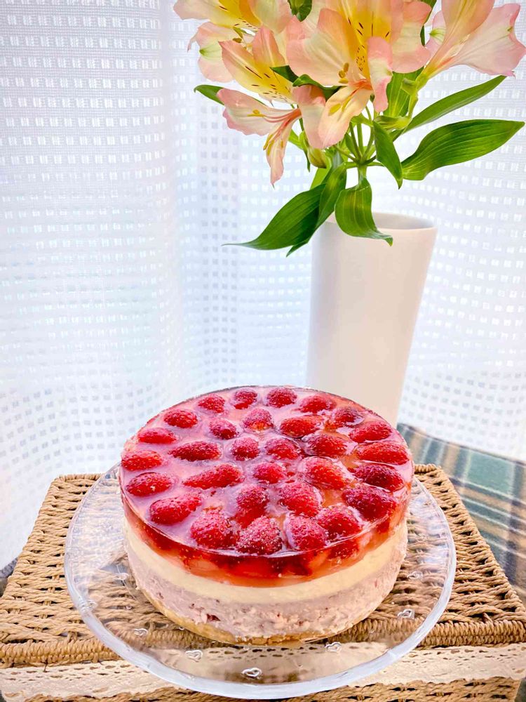 以前の投稿していたレモンレアチーズケーキ🍋の別バージョン✨イチゴレアチーズケーキ🍓です🤗💕友人のバースデイケーキとして作りました🎶春の香りです🥰💗