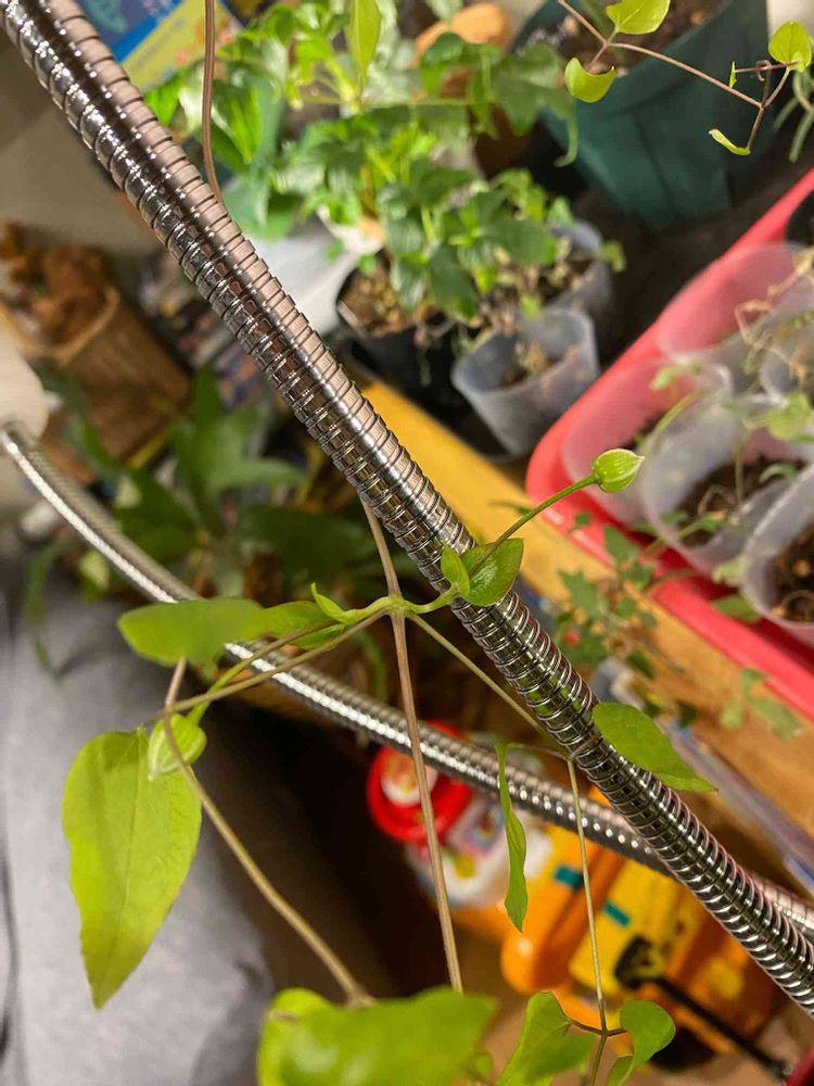見えづらい画像ですが、育苗ライトに絡みついてる挿木クレマチスちゃんに蕾が!