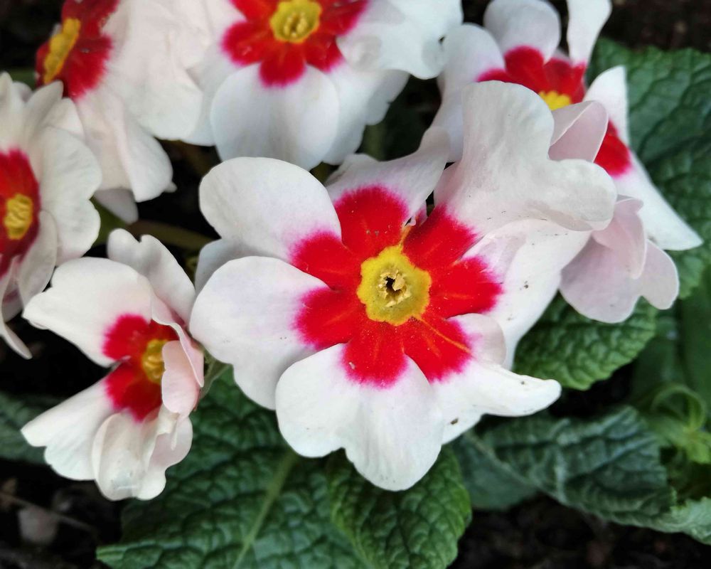 プリムラ・ジュリアンの花芯の周りが紅い白ベースの花 2023-02-28