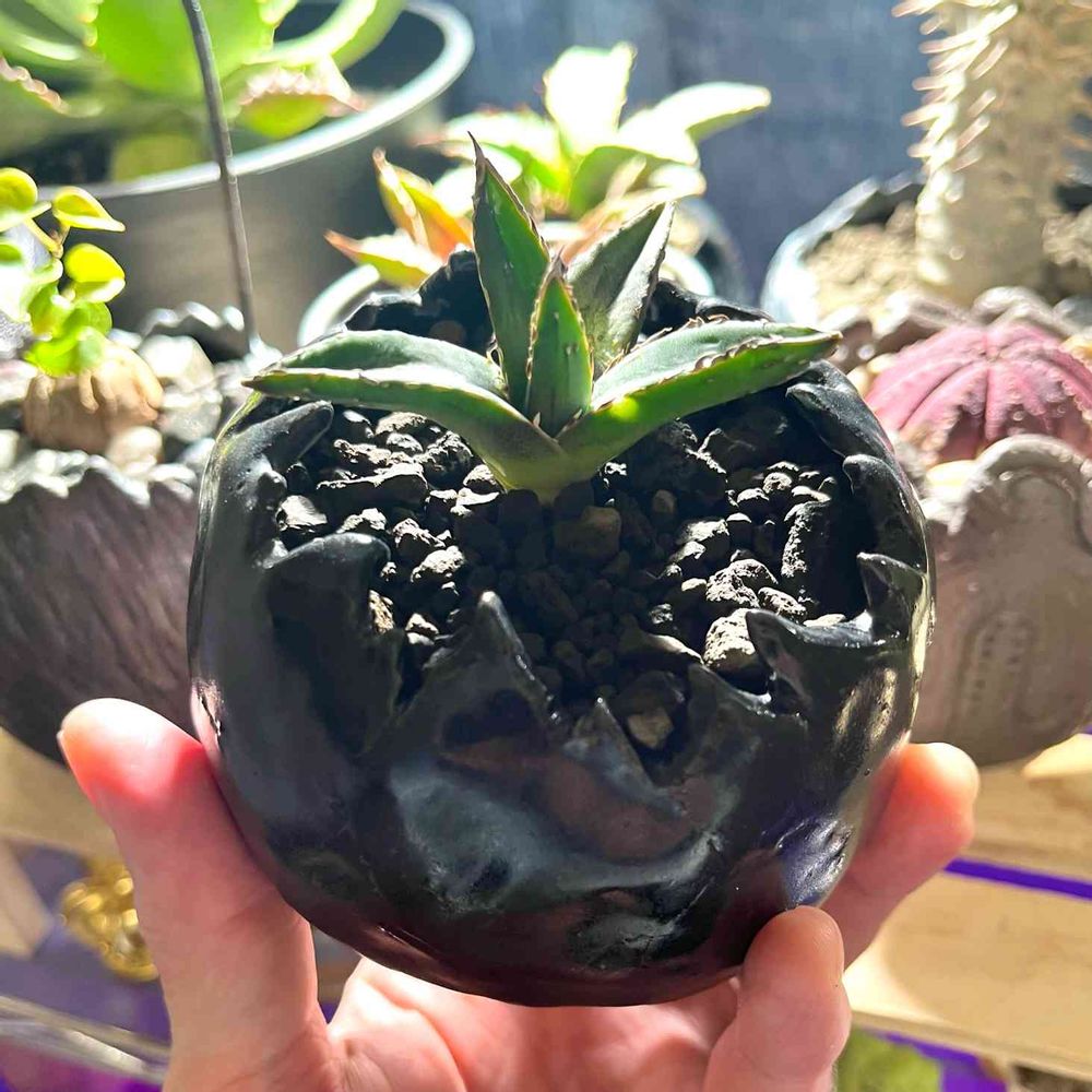 王妃雷神が収まっていたこの手作りの鉢には、道の駅からお迎えして育てている笹の雪を収めてみました🪴
