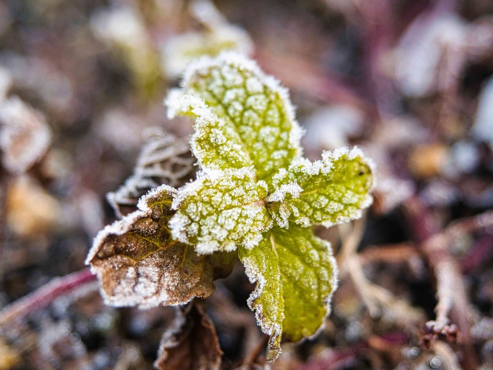葉っぱに霜がビッチリ付いてます