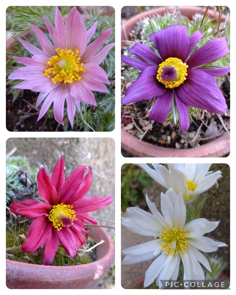 オキナグサ 紫も咲いて、4色揃いました。売られているのは、葉もきれいだけど、冬越ししたものは、葉が不揃いです。