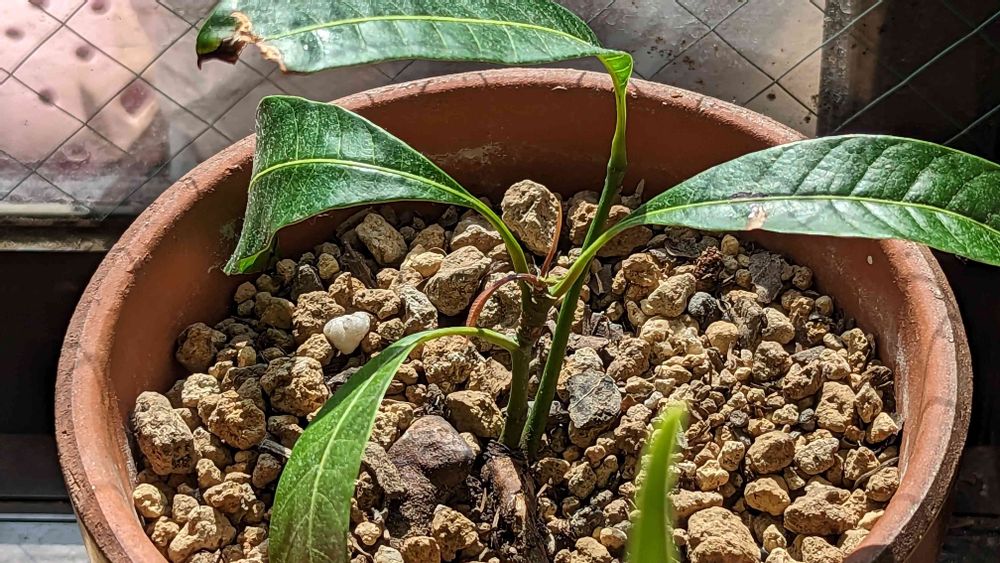 種から育てたマンゴー、ようやく新芽が。室内でも春を感じているんですね😊