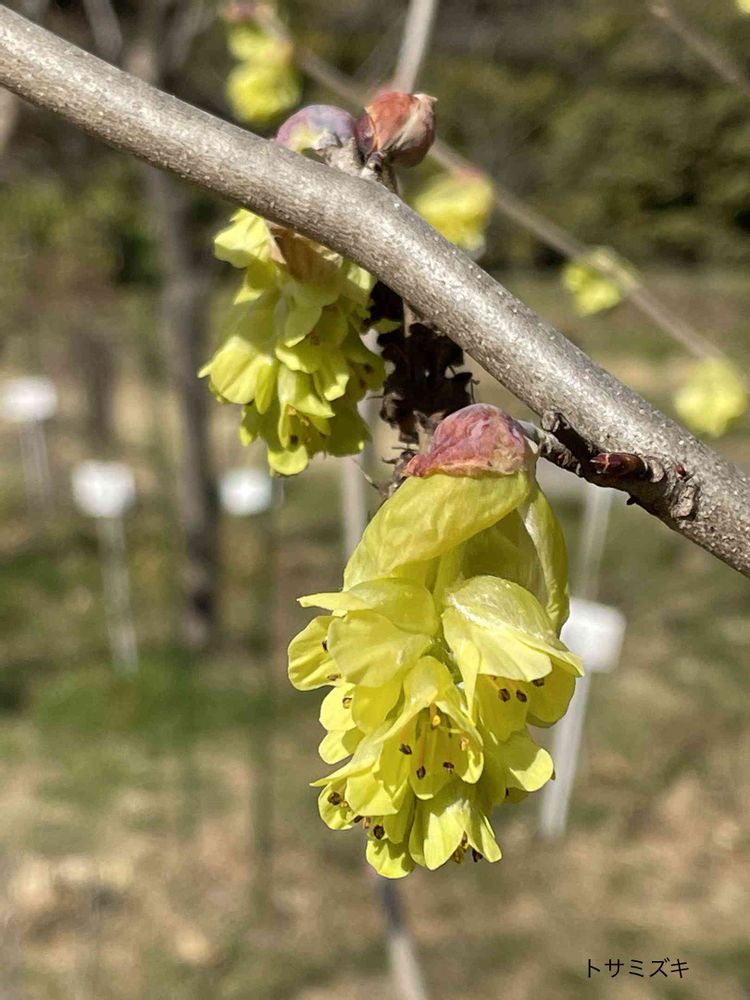 土佐水木…葉が出るより先に丸みのある黄色い花を吊り下げて咲かせます、房は5〜8個の小さな花が集まって一つの花になっている