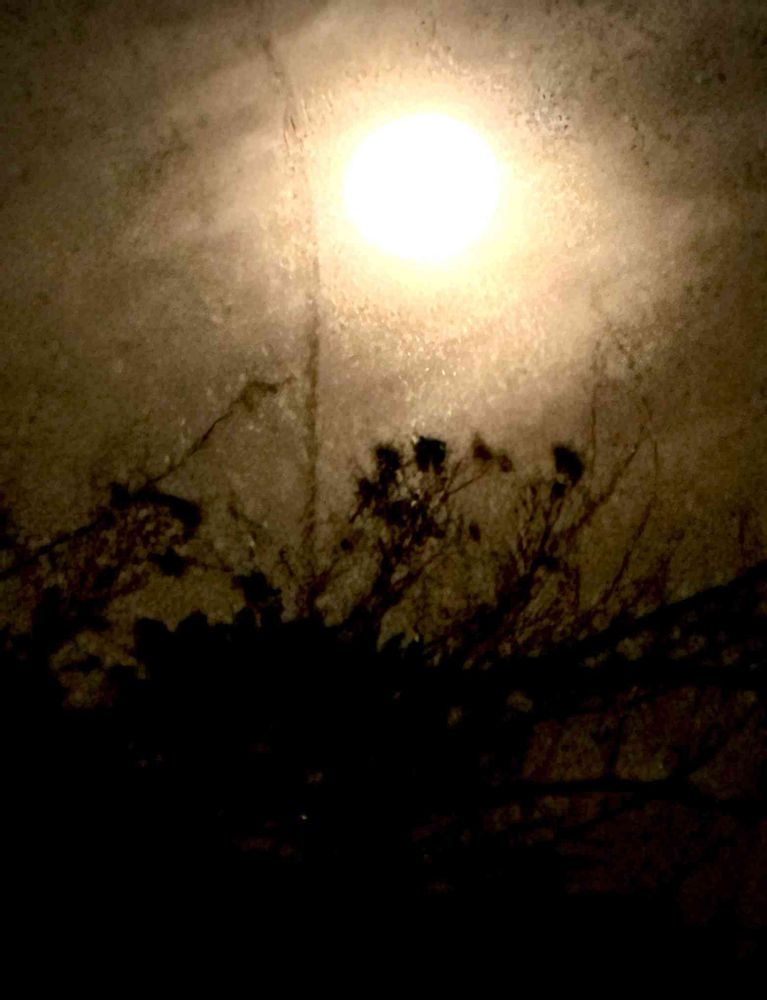 📝この写真画像は、我が家の万葉の中庭に植栽しているブーゲンビリアの枝木越しに、満月:望月/芋虫月を撮影したものデス🐶