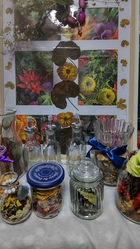乾かした、花を、可愛い、瓶に、摘めますよ香りの良い、葉もね、ペタルボトル🏷️と、花ともさんに、ネーム、着けて、頂き、ました😍