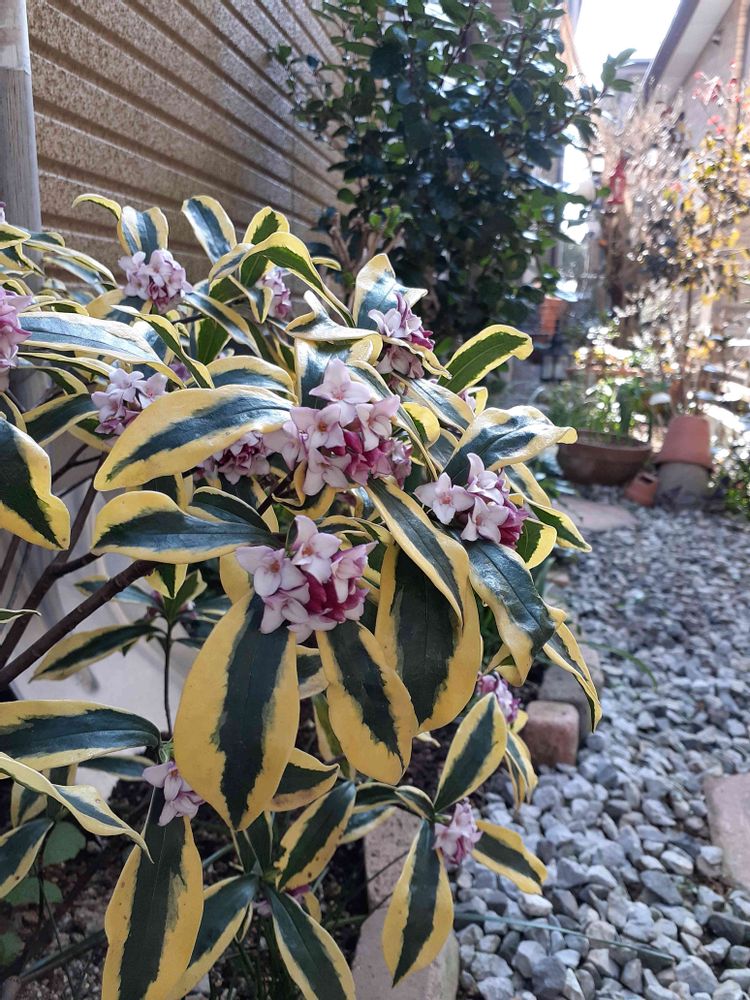 花壇の沈丁花は、花が咲き揃いはじめ良い香りを楽しめます!!