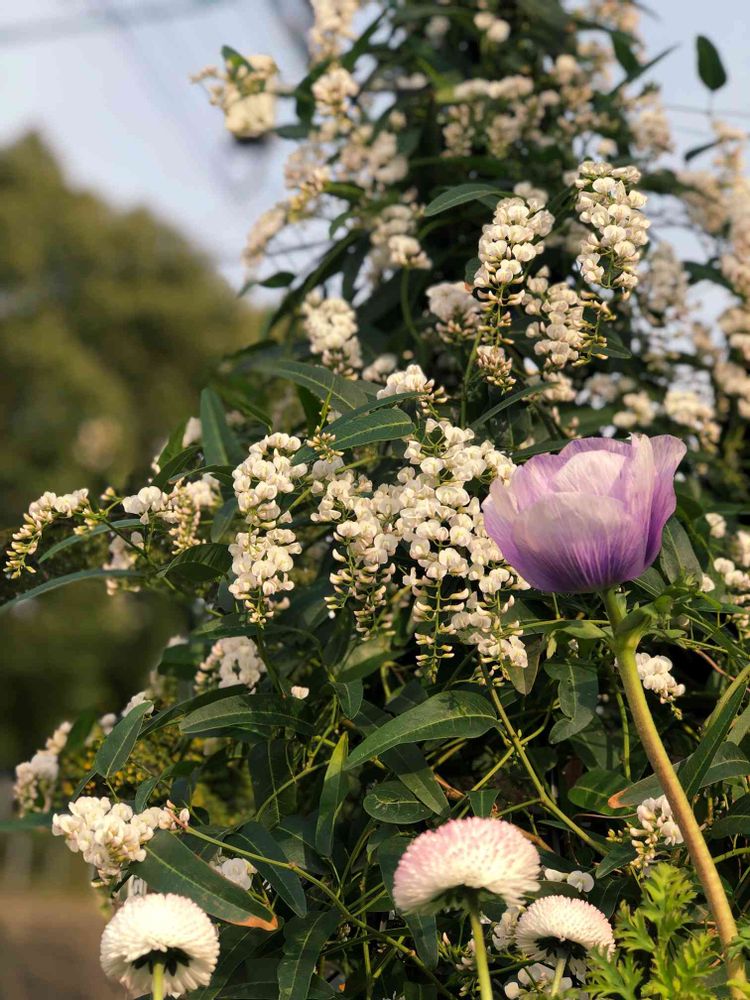 後ろはハーデンベルギア、去年春に白と紫の2色でお迎えしたのですが、夏に調子崩して紫は脱落🤣