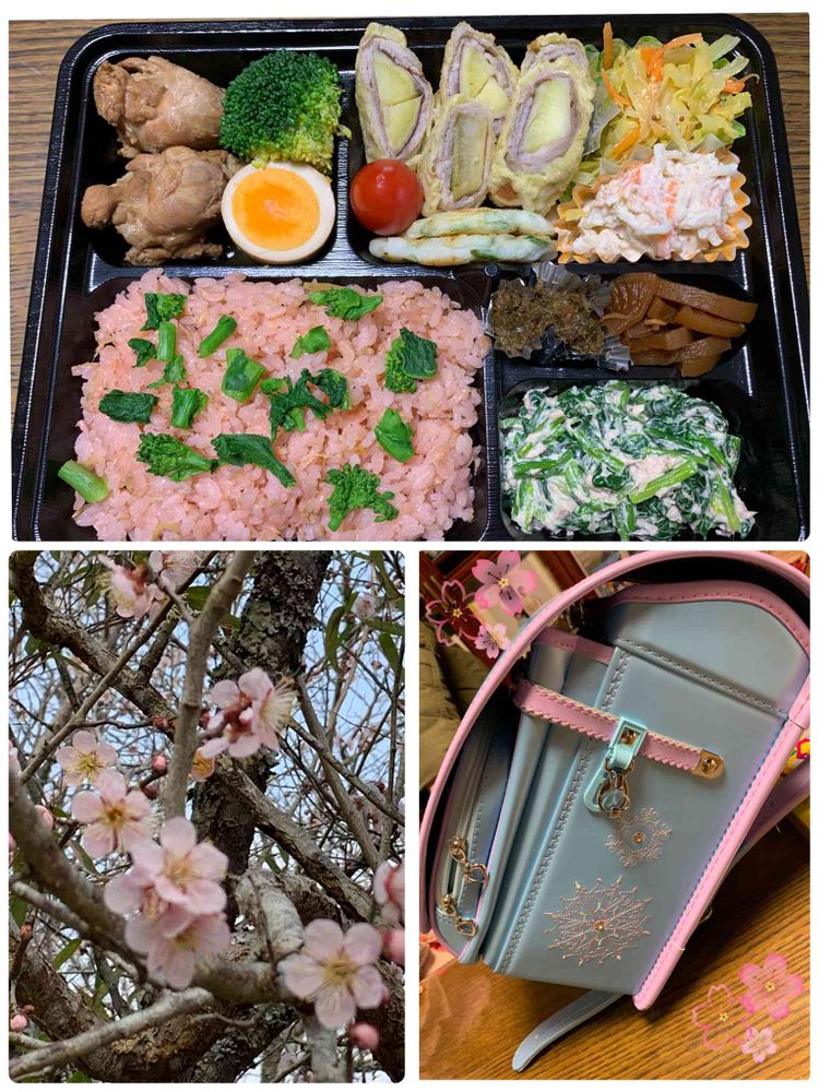 美味しそうなお弁当、可愛いランドセル🎒、優しい色合いの梅の花と三拍子揃った春爛漫のアッブをありがとうございます😆💕✨。とても、ほっこりです🎵😍🎵。